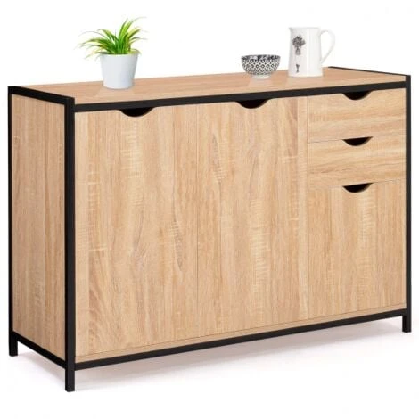 Place au design industriel dans votre salle à manger avec le buffet bas DETROIT bi-matière en bois et métal. Ses lignes discrètes et ses coloris sobres et chaleureux se marieront à merveille avec votre décoration intérieure !Ultra fonctionnel, ce bahut est doté d’un grand placard qui vous permettra de ranger votre nécessaire de cuisine ou votre vaisselle. Son étagère centrale est réglable sur 3 positions pour s’adapter au mieux à vos besoins. Un second placard, plus petit, vous servira pour vos livres de recette ou vos documents personnels.Enfin, deux tiroirs pratiques complètent ce buffet. Placez-y couverts ou objets du quotidien à la façon d’un vide-poche !Avec ses multiples rangements, ce buffet-commode trouvera également sa place dans une chambre ou un bureau pour ranger toutes vos affaires !Sa structure bi-matière bois (PB épaisseur 1,5 cm) et métal (tubes 1,6 x 1,6 cm) lui assure stabilité et robustesse pour un usage au quotidien !Craquez pour ce buffet pratique et déco aux multiples espaces de rangement !Dimensions du buffet bas avec portes et tiroirsDimensions totales : Longueur 110 cm x largeur 40 cm x Hauteur 75,5 cmDimensions placard principal : L. 72 x l. 38,5 x H.65 cmEtagère ajustable incluse (3 positions possibles)Dimensions placard de droite : L.32,5 x l. 38,5 x H.38,5 cmDimensions tiroirs : L. 27,5 x l. 28,5 x H. 10,5 cmHauteur des pieds : 5,5 cmÉpaisseur des plateaux en particules de bois : 1,5 cmÉpaisseur des tubes en métal : 1,6 x 1,6 cmÀ monter soi-même Retrouvez l’ensemble de nos buffets ainsi que notre collection industrielle sur notre boutique en ligne ! – HORS CORSE -article non livrable en Corse