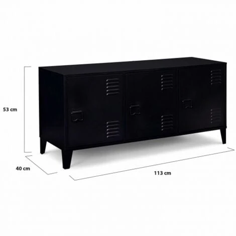 Besoin d’un espace de rangement supplémentaire ? Ce buffet bas industriel noir tendance et pratique s’adaptera facilement aux différentes pièces de votre maison (salon, cuisine, salle à manger, entrée).Sa couleur noire classique et intemporelle lui permet de s’accorder à n’importe quelle décoration intérieure, pour un look sobre et élégant.Le buffet style industriel est non seulement esthétique mais aussi fonctionnel ! Grâce à ses 3 placards et à ses étagères intérieures multiposition, vous disposez de rangements fermés pour votre vaisselle légère, votre linge de maison ou pour classer et ordonner vos magazines, DVD, box internet, consoles et autres équipements hi-fi.En effet, avec son trou passe-câbles et son long plateau de 113 cm, ce buffet industriel peut également servir de meuble TV, pour passer d’agréables soirées confortablement installé dans votre lit ou votre canapé ! Ses 4 pieds en métal lui garantissent stabilité et robustesse, sans oublier le côté design renforcé par les portes en métal avec grilles d’aération aux finitions soignées !Inscrit dans la tendance industrielle qui investit les intérieurs les plus modernes, ce buffet noir est un must-have.Il ne vous reste plus qu’à profiter du nouveau look de votre pièce de vie !Dimensions du buffet industriel noir 3 portes ESTERDimensions globales : Longueur 113 cm x largeur 40 cm x Hauteur 53 cmLongueur des portes : 35 cm1 étagère multiposition à l’intérieur de chaque placardHauteur des pieds : 10 cmPortes et pieds en métalStructure en PB 1,5 cm (particules de bois)À monter soi-même Modèle également disponible en coloris blanc et noir plateau bois.Retrouvez l’ensemble de nos meubles métal ainsi que notre collection industrielle sur notre boutique en ligne !