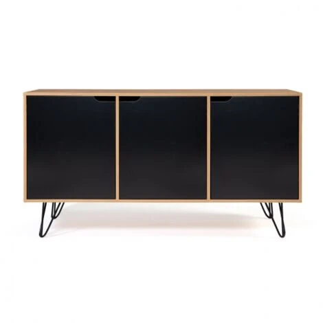 Laissez entrer le style rétro chic chez vous avec le buffet bas vintage NOEMI 3 portes. Ses coloris chics et élégants lui permettent de s’intégrer à n’importe quel intérieur, pour une décoration chaleureuse et tendance.Fonctionnel et utile, le buffet bas 3 portes NOEMI offre l’avantage d’avoir plusieurs rangements. Grâce à ses trois placards fermés par une porte à poignée type encoche, rangez votre vaisselle, vos appareils ménagers, vos livres de cuisine, ou encore vos papiers en toute discrétion.Avec son plateau d’une longueur généreuse de 113 cm, il sera le parfait support pour y disposer objets de décoration ou appareils multimédia selon vos besoins. Design et pratiques, ses quatre pieds épingle originaux forme trombone en métal lui assurent stabilité et robustesse au quotidien, ainsi qu’une ligne aérienne pour ne pas encombrer votre salon !Dans un salon, une salle à manger ou toute autre pièce de la maison, le buffet bas vintage NOEMI 3 portes s’accorde à vos envies de déco tendance et actuelle grâce à ses couleurs sobres et chaleureuses.Il ne vous reste plus qu’à vous installer confortablement dans votre séjour et à profiter du nouveau look de votre pièce de vie !Dimensions du buffet bas vintage NOEMI 3 portesDimensions totales : Longueur 113 cm x largeur 45 cm x Hauteur 60 cmDimensions des placards : L. 35,5 x l. 43 x H. 43 cmHauteur des pieds : 15 cmStructure en panneaux de particules de bois (PB), épaisseur 1,2 cmPieds épingles en métal noir À monter soi-mêmeRetrouvez toute notre collection de meubles vintage sur notre boutique en ligne !