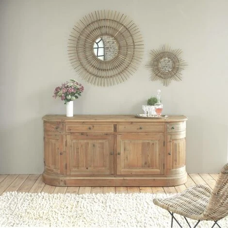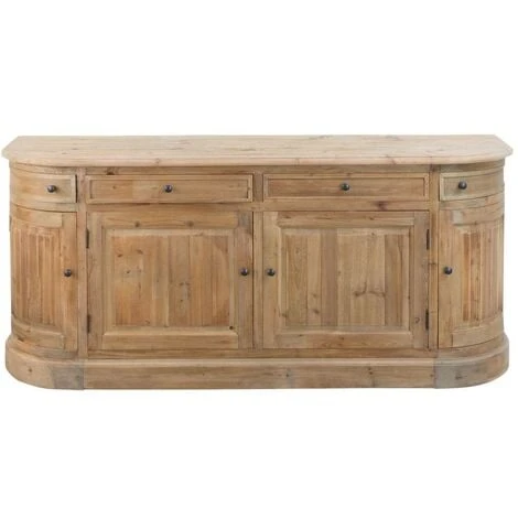 Ce buffet arrondia été réalisé à partir de vieux pin brossé qui lui confère un charme indéniable. Vous allez adorer les nuances claires et lumineuses de son bois qui apporteront des ondes positives au sein de votre intérieur. Petit coup de coeur pour ses poignées en laiton qui apportent une petite touche de modernité à l’ensemble du meuble. Il a été pensé de façon à vous offrir un maximum d’espaces de rangements. Il comporte donc 4 portes (avec une planche pour chaque porte à l’intérieur), et se décline en deux versions : 9 tiroirs pour le grand modèle, et 4 tiroirs pour le petit modèle. Ce buffet enfilade est livré monté,