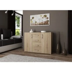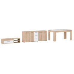 Pilvi Ensemble Meuble TV Buffet & Table A Manger – Blanc Mat Et Chene Sonoma