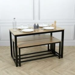 Lot D’une Table Et De 2 Bancs Chelsea – Bois Et Noir – Longueur 120, Profondeur 60, Hauteur 73 Cm