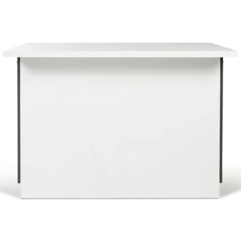 L’espace de votre intérieur, de votre cuisine sera optimisé grâce à notre îlot central avec plan de travail et rangements incorporés en bois coloris blanc et gris !Le design moderne de cet îlot central, ses lignes droites et épurées, ses couleurs sobres tout en contraste, et ses finitions mates lui permettent de s’adapter idéalement à tout type d’intérieur ! Il conférera un aspect net et rangé à votre cuisine !Son format généreux néanmoins compact, peu encombrant, facilite la circulation tout en évitant les pas inutiles au quotidien dans votre pièce de vie. Il structure l’espace de votre cuisine ! Parfait pour les pièces de vie ouvertes et aérées!Cet îlot central de forme rectangulaire classique est idéalement conçu pour recevoir 2 couverts. Ambiance cosy pour des petits-déjeuners à 2 !Son plateau épaisseur 3 cm offre un solide plan de travail large et profond pour poser plats, bouteilles, etc. Ce plan de travail débordant sur un côté a pour avantage de servir de mange-debout et de pouvoir ainsi manger sur le pouce debout ou sur un tabouret de bar !Pratique et fonctionnel, il constitue une véritable solution de rangement rapide pour l’aménagement des petits espaces car il dispose de 2 portes latérales à chaque extrémité aux jolies poignées argentées façon chrome, donnant sur 2 compartiments dotés d’une étagère intermédiaire pour organiser votre rangement ! Discrets, cachés sous le plan de travail, ils représentent un véritable gain de place !Vous bénéficiez ainsi de nombreux espaces de rangement pour vos ustensiles, couverts, vaisselle, bouteilles et condiments ! De plus, vous les conservez à portée de main et vous optimisez l’espace !La structure en PB (panneaux de particules, épaisseur 1,5 cm) lui apporte stabilité et robustesse.Tantôt coin repas, tantôt coin cuisine, avec sa triple fonction table haute/plan de travail/meuble de rangement, il vous fera gagner du temps et de l’espace, et apportera un look contemporain à votre intérieur !Optez sans tarder pour cette installation tendance et conviviale à la fois fonctionnelle et décorative !Dimensions de l’îlot central de cuisine blanc et grisDimensions globales : Longueur 120 cm x largeur 80 cm x Hauteur 82 cmdimensions placards : L. 59 x l. 54,5 x H. 70 cmNettoyage rapide et entretien facile avec chiffon humide douxÀ monter soi-mêmeProduit vendu seul, sans les tabouretsCet îlot de cuisine 120 cm avec quatre portes existe également dans d’autres coloris :- îlot central 120 cm imitation hêtre et portes blanches- îlot central 120 cm blanc et plateau effet béton- îlot central 120 cm blanc et plateau gris anthracite- îlot central 120 cm noir et plateau hêtre – îlot central 120 cm hêtre et portes noires- îlot central 120 cm blanc plateau hêtreDécouvrez également l’ensemble de nos meubles et éléments de cuisine sur notre boutique en ligne ! – HORS CORSE -article non livrable en Corse