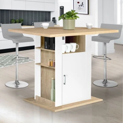 Descriptif de l’îlot central avec rangements design contemporainOptimisez et organisez l’espace de votre cuisine grâce à notre îlot central avec plan de travail et rangements intégrés au coloris en bois blanc et imitation hêtre !Le look tendance de cet îlot central, ses lignes droites et épurées et ses couleurs sobres tout en contraste lui permettent de s’adapter idéalement à tout type d’intérieur ! Il conférera un aspect net et rangé à votre cuisine !Son format généreux et néanmoins compact, peu encombrant, facilite la circulation tout en évitant les pas inutiles au quotidien dans votre pièce de vie. Il structure l’espace de votre cuisine ! Parfait pour les pièces de vie ouvertes et aérées.Avec son grand plateau 110 x 80 cm solide (PB épaisseur 3 cm), cette table de bar vous offrira un plan de travail supplémentaire pour concocter de bons petits plats. Le plateau déborde de chaque côté de la structure centrale pour vous permettre de glisser en-dessous des tabourets de bar et accueillir ainsi jusqu’à 6 personnes !Ultra fonctionnel ce meuble de bar comporte de nombreux rangements. Un placard central qui s’ouvre de chaque côté vous permettra d’entreposer vaisselle, couverts et ustensiles de cuisine et d’y accéder facilement grâce à ses deux portes. Sur le côté, les 3 étagères seront parfaites pour garder à portée de main condiments, verres ou encore bouteilles. De quoi optimiser au maximum votre espace !Sa structure robuste en PB (panneaux de particules de bois, épaisseur 1,5 cm) lui assure stabilité et robustesse pour un usage au quotidien !Tantôt coin repas, tantôt coin cuisine, avec sa triple fonction table haute de bar/plan de travail/meuble de rangement, il vous fera gagner du temps et de l’espace, et apportera un look contemporain à votre intérieur !Optez sans tarder pour cette installation tendance et conviviale à la fois fonctionnelle et décorative !Dimensions de la table îlot de cuisine bois blanc et imitation hêtreDimensions globales : Longueur 110 cm x largeur 80 cm x Hauteur 90 cmDimensions placard : Longueur 40 cm x largeur 36,5 cm x Hauteur 60 cmDimensions niche centrale : Longueur 40 cm x largeur 17 cm x Hauteur 27 cmDimensions étagères latérales : Longueur 36 cm x largeur 10 cm x Hauteur 15,5 / 15,5 / 44 cm (de haut en bas)Dimensions socle : Longueur 80 cm x largeur 60 cm x Hauteur 1,5 cmEpaisseur plan de travail : 3 cmProduit vendu seul, sans les tabourets.Modèle également disponible coloris blanc et imitation hêtre, ainsi qu’en design industriel- Ilot central UGO 110 cm bois blanc et gris avec rangements- Ilot central UGO 110 cm bois noir et imitation hêtre avec rangements design industrielRetrouvez l’ensemble de nos meubles de cuisine sur notre boutique en ligne ! – HORS CORSE -article non livrable en Corse