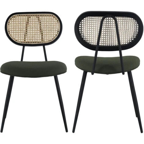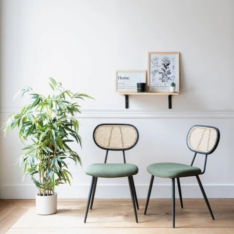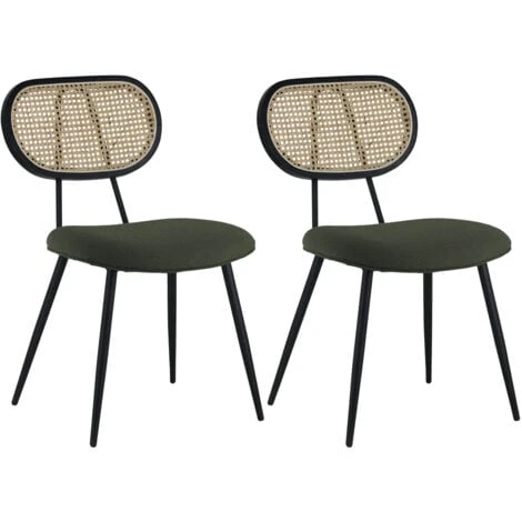 Optez pour ce lot de 2 chaises de salle à manger vintage ELENA en cannage et tissu boucle, élégantes et confortables pour votre espace repas. Ces sièges d’intérieur sont fabriqués à partir de rotin tressé à la main, offrant un design unique. Les pieds en métal noir ajoutent une touche moderne à leur style vintage. Vous pourrez profiter de moments conviviaux et confortables avec vos invités ou en famille autour de votre table de salle à manger. L’esthétique en cannage apporte une touche de naturel et d’authenticité à votre intérieur. Offrant une assise confortable, ces chaises vintage sont un choix parfait pour tous ceux et toutes celles qui recherchent un mobilier de qualité et tendance pour leur intérieur.