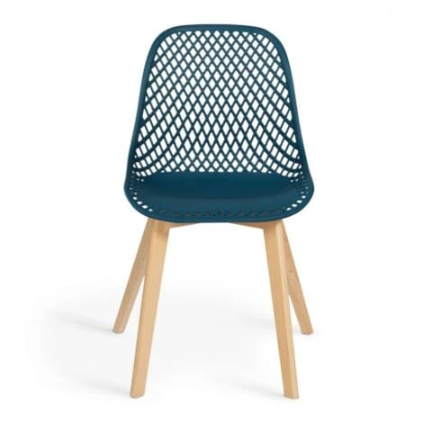 Vous êtes à la recherche de chaises design avec une assise qui soit aussi belle que confortable ? Choisissez notre modèle MANDY ! Le dossier ajouré des chaises apportera au modèle un style graphique très en vogue en ce moment. Que vous choisissiez de les installer dans votre salle à manger, votre cuisine ou encore votre bureau, ces chaises scandinaves bleu canard trouveront leur place à coup sûr dans n’importe laquelle des pièces de votre maison.En plus d’apporter une touche de modernité à votre pièce, elles offrent un confort des plus agréables. Le dossier de ces chaises en polypropylène apportera flexibilité et solidité au modèle. Très stables, elles disposent de 4 pieds en bois de hêtre aux finitions travaillées.De couleur bleu canard, elles s’accorderont à tous les styles d’intérieur, et s’adapteront à votre mobilier. De plus, leur pieds en bois de hêtre apporteront du cacher à l’ensemble de la chaise.Profitez d’un design tendance et d’un petit prix avec ce joli lot de 4 chaises.Dimensions du lot de 4 chaises MANDY bleu canard- Dimensions totales : Longueur 54 cm x largeur 56 cm x hauteur 86 cm- Largeur d’assise : 46 cm- Hauteur d’assise : 46 cm- Vendues en lot de 4 – Coloris bleu canard- Dossier en polypropylène- Pieds en bois de hêtre- À monter soi-mêmeDécouvrez tous nos autres modèles de chaises scandinaves sur notre boutique en ligne !