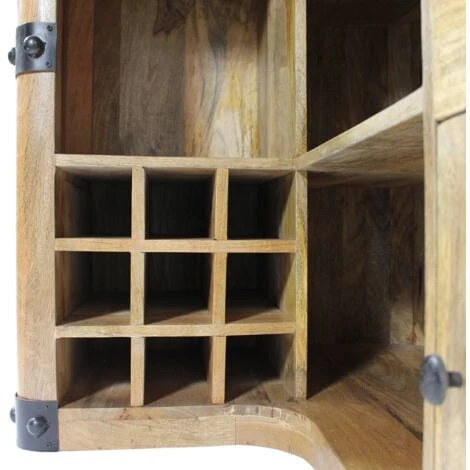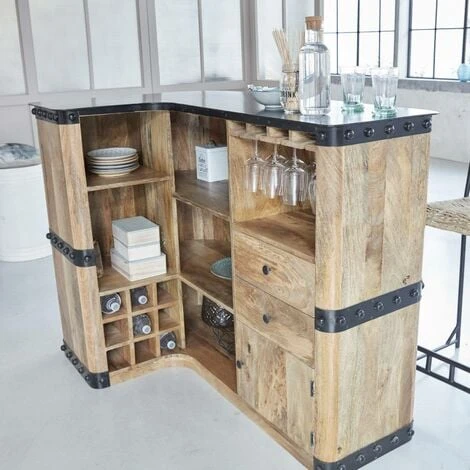 Le principal atout de ce bar est l’originalité. On aime les nuances claires de son bois de manguier, on adore le plateau du bar qui est en métal noir, on raffole des détails industriels qu’on retrouve de manière affirmée et qui donnent une réelle identité au meuble, enfin on le choisi pour sa capacité de rangement et son ergonomie très bien pensée. Ce bar met l’accent sur un rangement organisé en vous proposant tous types de stockage. Vous profitez d’un repose verre, d’un range bouteille, de 6 niches ouvertes, de 2 tiroirs ainsi que d’une niche fermée à l’aide d’une porte. Tout est prévu afin de faciliter votre quotidien.