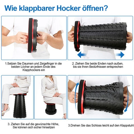 Pliable et réglable en hauteur : grâce au système de verrouillage unique, vous pouvez ouvrir ou plier le tabouret pliable en quelques secondes. Après l’ouverture, veuillez tourner la boucle de verrouillage avec précaution. Le tabouret pliant est également
