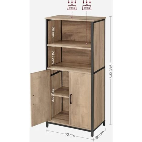 - [Large espace] Avec 1 dessus, 2 compartiments ouverts, 1 compartiment fermé et 1 étagère intérieure réglable en 3 hauteurs, ce buffet de 35 x 60 x 124,5 cm offre beaucoup d’espace pour vos livres, décorations, ustensiles de cuisine ou papeteries de bureau