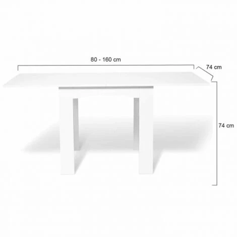 Subjuguez votre entourage avec la table pliante/extensible DONA !Compacte et carrée une fois pliée et les rallonges rangées, elle s’adaptera parfaitement à un petit espace. Adoptez sa taille minimum pour gagner de la place et donner du volume à votre pièce ! Idéal pour une cuisine ou un salon-salle à manger 2-en-1 ! Un véritable confort au quotidien ! Vous avez vu grand, recevez du monde de façon impromptue ou organisez un repas de famille? Pas besoin de deuxième table.Grâce à son système ingénieux de rallonges pliables à la façon d’un portefeuille, transformez-là en un instant!Avec ses dimensions généreuses une fois dépliées 160 x 78 cm et son format rectangulaire, installez jusqu’à 6-8 couverts selon vos assises pour des repas mémorables !Son design contemporain et épuré, mélange de lignes droites et arrondies, ainsi que son coloris blanc chic et moderne, apporteront de la luminosité à votre intérieur.En plus d’être fonctionnelle, les courbes arrondies du piétement assurent d’être confortablement installé.Stable et robuste, en panneaux de particules, dotée de pieds d’une largeur de 11 cm, ne craignez pas d’y poser votre vaisselle, vos vases et plats …Grâce à ses dimensions pratiques même un fois repliée, Longueur 80 cm x largeur 78 cm, en véritable caméléon, servez-vous en comme bureau d’appoint selon vos besoins du moment. Largement suffisant pour y disposer livres, papiers, ordinateur!Un table multi fonctions design parfaite pour tous les jours et les grandes occasions !Dimensions de la table à manger DONA pliable/extensible :Dimensions totales pliée : Longueur 80 x largeur 78 x Hauteur 76 cmDimensions totales dépliée : L.160 x l. 78 x H. 74 cmDimensions des pieds : L. 11 x l. 11 cmEspace entre les pieds : 52 cmSolide, elle est surélevée de 4 pieds en boisPlateau épaisseur : 2 cmÀ monter soi-mêmeRetrouvez tous nos coloris et modèles contemporains sur notre boutique en ligne :- Table à manger extensible DONA 6-8 personnes hêtre 80-160 cm- Table à manger extensible DONA 6-8 personnes plateau effet béton ciré 80-160 cm- Table à manger extensible DONA 6-8 personnes noire plateau façon hêtre 80-160 cmA associer par exemple avec le lot de 6 chaises ROMANE grises.