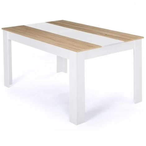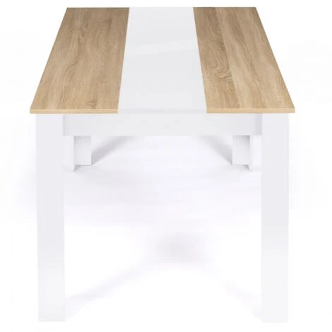 Vous êtes à la recherche d’une table à la fois tendance et pratique ? Découvrez la table à manger GEORGIA avec son plateau de 160 cm pouvant accueillir jusqu’à 8 personnes !Cette table en particules de bois (1,5 cm) au plateau bicolore apportera une touche chaleureuse et contemporaine à votre intérieur et se mariera à merveille avec votre mobilier !Son plateau blanc est composé de 2 coloris pour un aspect encore plus tendance ! Le détail en plus de cette table, c’est la ligne centrale en MDF blanche avec finition brillante pour apporter une touche de lumière. Ses dimensions compactes 160 x 75 cm vous permettront de recevoir confortablement jusqu’à 8 invités sans pour autant occuper trop de place dans votre salle à manger !Stable et robuste, la table est surélevée de 4 pieds en bois 10 x 10 cm qui lui assurent une bonne stabilité.Craquez pour cette table à manger bicolore qui réchauffera l’ambiance de votre salle à manger.Dimensions de la table à manger GEORGIA 8 personnes blanche et imitation hêtreDimensions totales : Longueur 160 cm x largeur 90 cm x Hauteur 75 cmDimensions des pieds : L. 10 x l. 10 x H. 73,5 cmEspace entre les pieds sur la largeur : 66,5 cmDimensions plaque centrale : L. 160 x l. 30 cm4 pieds en boisMatériaux : panneaux de particules de bois (PB), épaisseur 1,5 cm8 patins de protection au piétement sont fournisÀ monter soi-mêmeRetrouvez tous nos coloris contemporains sur notre boutique en ligne :- Table à manger GEORGIA 8 personnes façon hêtre et noire 160 cm- Table à manger GEORGIA 8 personnes blanche et grise 160 cm- Table à manger GEORGIA 8 personnes blanche et noire 160 cm- Table à manger GEORGIA 8 personnes imitation hêtre et blanche 160 cm- Table à manger GEORGIA 8 personnes noire et imitation hêtre 160 cm
