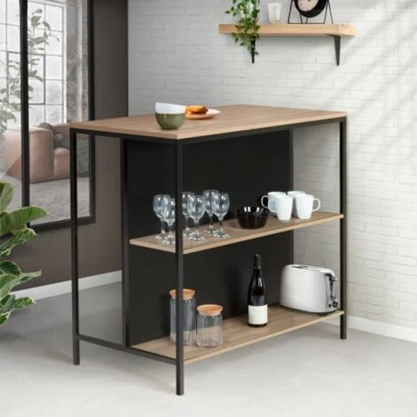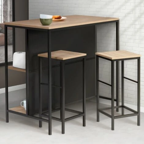 Si vous cherchez à aménager votre espace cuisine de manière optimisée, la table de bar DETROIT et ses 2 tabourets sont faits pour vous !Avec son design industriel bi-matière bois et métal, ses coloris naturels et ses lignes sobres et épurées, le mange-debout DETROIT se mariera avec tous les types d’intérieurs !Multifonction, ce meuble vous servira à la fois de plan de travail, de rangement et de table haute pour manger sur le pouce ou prendre un verre entre amis dans une ambiance décontractée !Son format compact est idéal pour aménager les petits espaces comme les studios ou venir délimiter l’espace de votre cuisine ouverte ! Les deux tabourets de bar se glissent sous le plateau pour un gain de place maximal !Hyper pratiques, ses 2 étagères vous permettront de ranger élégamment vaisselle, petit électroménager ou encore nourriture, optimisant ainsi votre rangement !Sa structure en panneaux de particules de bois (PB épaisseur 1,5 cm) et métal noir (2×2 cm) lui garantit solidité et stabilité.Un meuble compact et ultra fonctionnel spécialement conçu pour les petits espaces !Dimensions de la table de bar avec étagères et 2 tabouretsDimensions îlot : Longueur 100 cm x largeur 60 cm x Hauteur 95 cmDimensions étagères : Longueur 100 cm x largeur 30 cmHauteur entre chaque étagère : 40 cmDimensions des tabourets: Longueur 32 cm x largeur 32 cm x Hauteur 67 cmHauteur des pieds : 10 cmA monter soi mêmeRetrouvez nos meubles et éléments de cuisine ainsi que l’ensemble de notre collection industrielle sur notre boutique en ligne ! – HORS CORSE -article non livrable en Corse