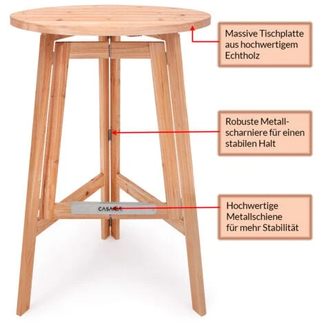 La table haute dispose d’un plateau rond de 78 cm de diamètre et d’une épaisseur de 27 mm. La structure est faite de trois pieds. Les pieds sont pliables les uns dans les autres et le plateau est rabattu sur le côté, permettant un rangement facile.